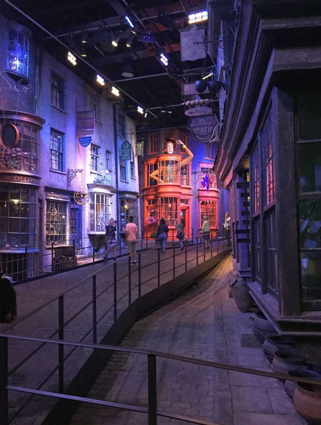 Rampayla yukarı tırmandıktan sonra kendinizi Diagon Alley’nin arnavut kaldırımlı yolunda buluyorsunuz. Burada da Oliver’in Asa Dükkanı, Flourish and Blotts, Gringotts Wizardry Bank ve Eeylops Owl Emporium gibi dükkanların vitrinlerini görebiliyorsunuz. Burada gözüken her malzeme de yine tek tek elle hazırlanmış. Vaktiniz kaldıysa detayları incelemek muhteşem.