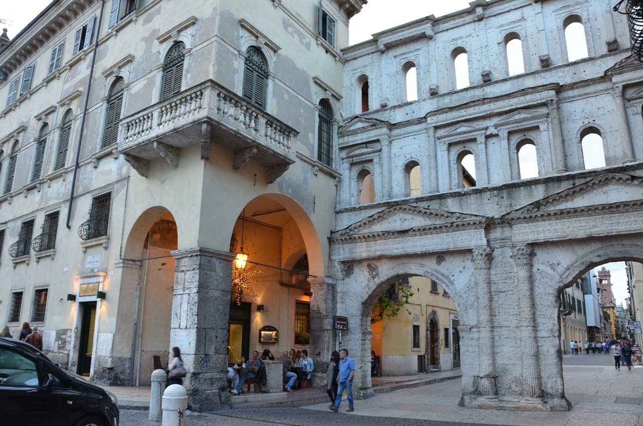 Caffe Rialto Roma döneminden kalma yerel beyaz kireçtaşından yapılmış Porta dei Borsari’nin yanında. Antik şehrin kutsal yolu olan Via Sacra (şimdiki adı Corsa Porta Borsaria)’ya açılan şehrin sur kapısı çok estetik bir tarihi yapı. İki kemeri ve üstte iki sıra penceresi var. Sütunların ana tavan başlığında MS 265 yılında İmparator Gallieno anısına şehrin duvarlarının restore edildiğini belirten bir yazıt bulunmakta…