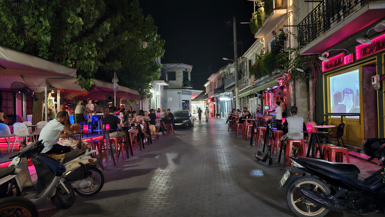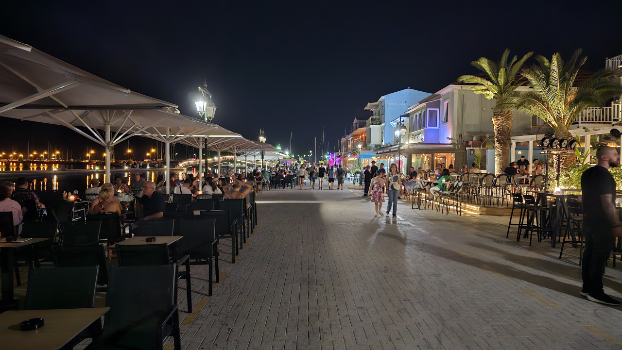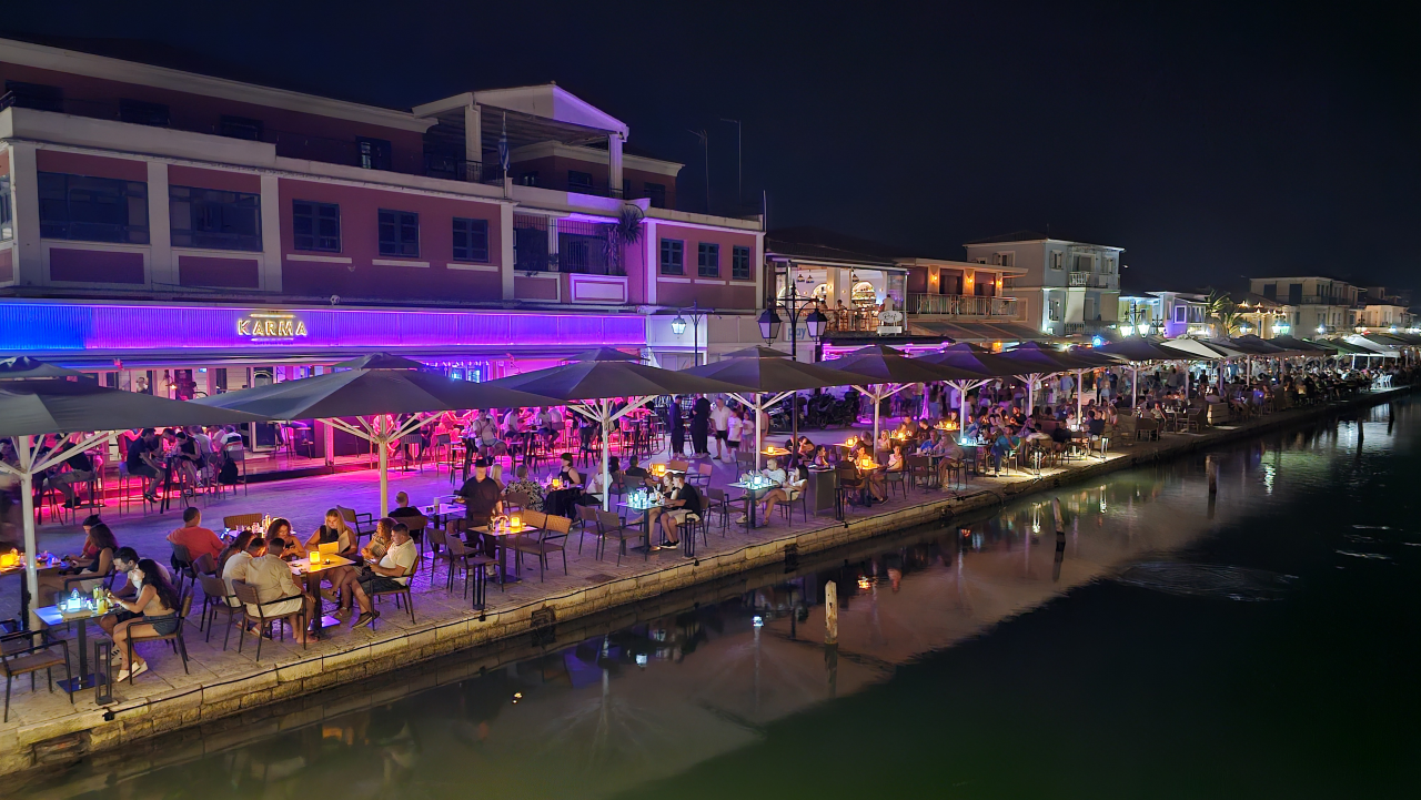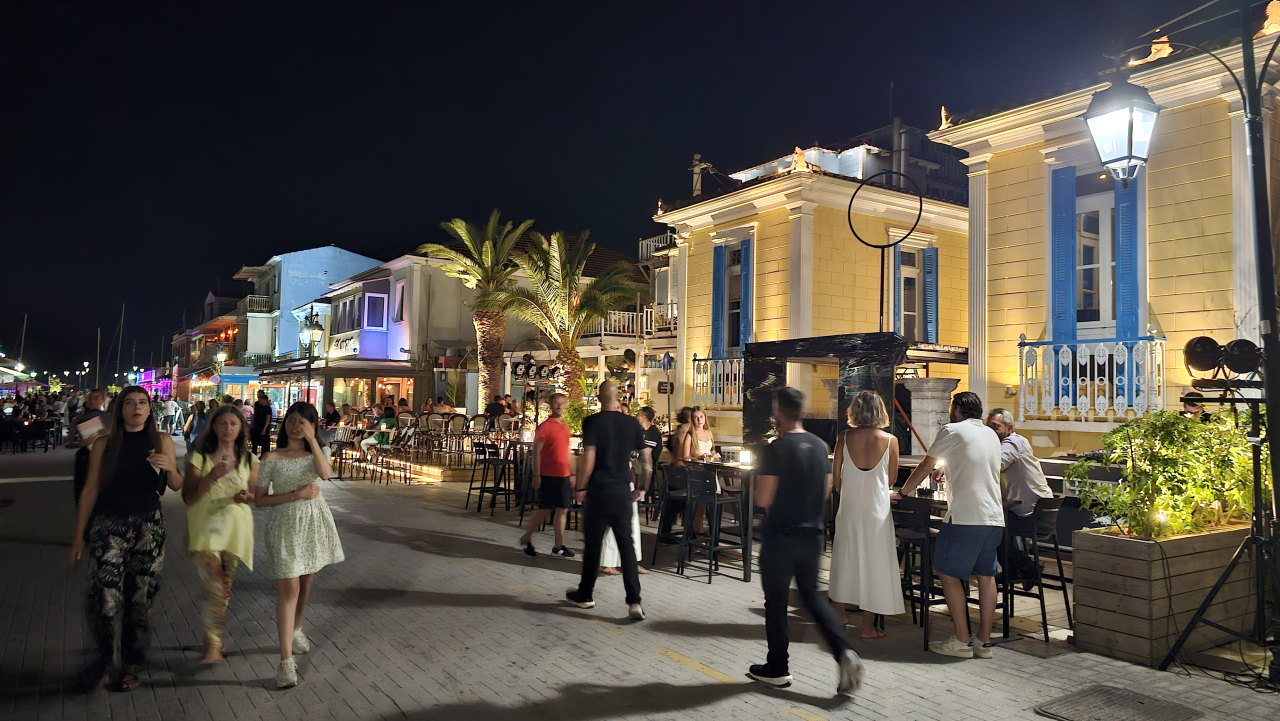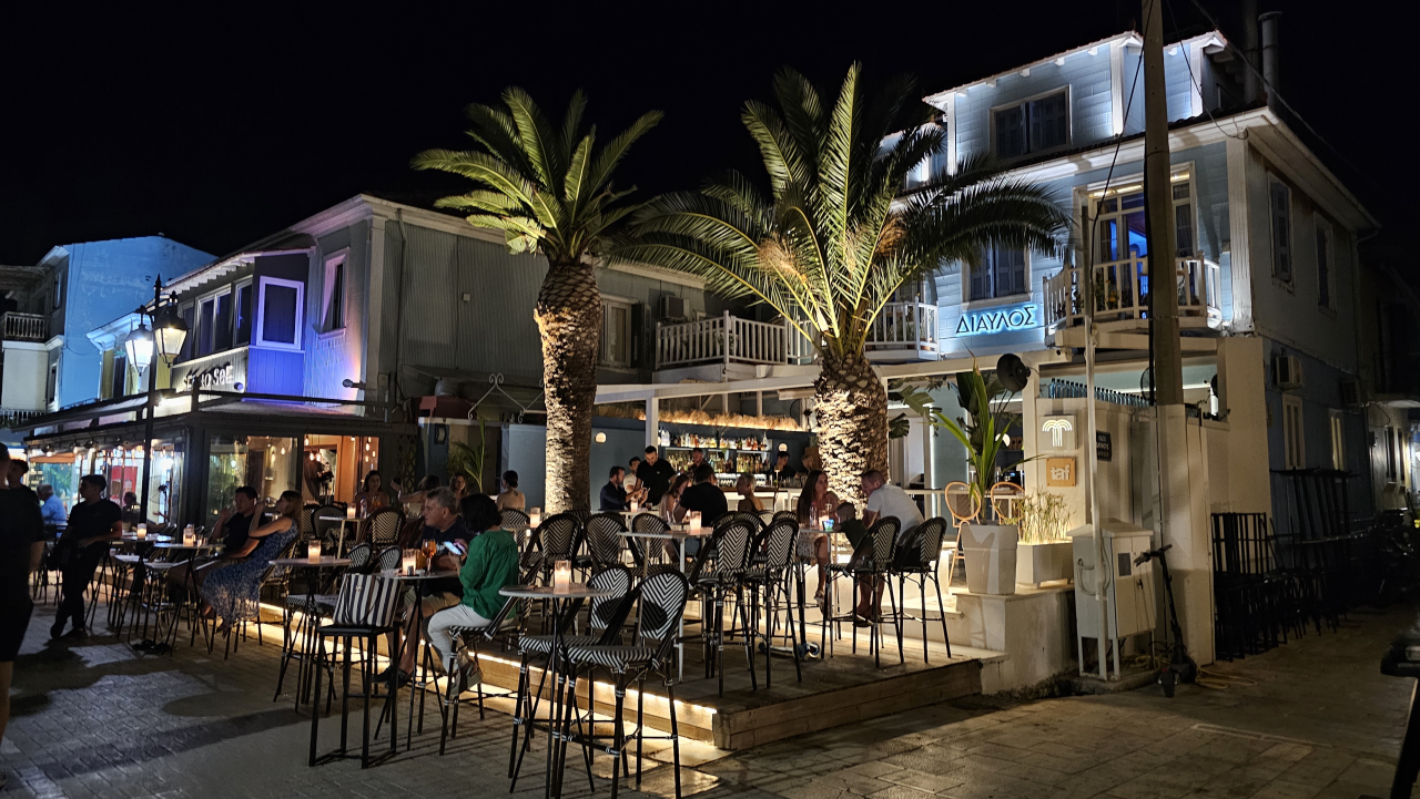 Lefkada merkezi, adayı keşfetmeden önce bir soluklanma ve yerel yaşama karışma noktası gibi. Biz bütün gece o sokak senin bu sokak benim gezerek adanın ruhunu içimize çektik.