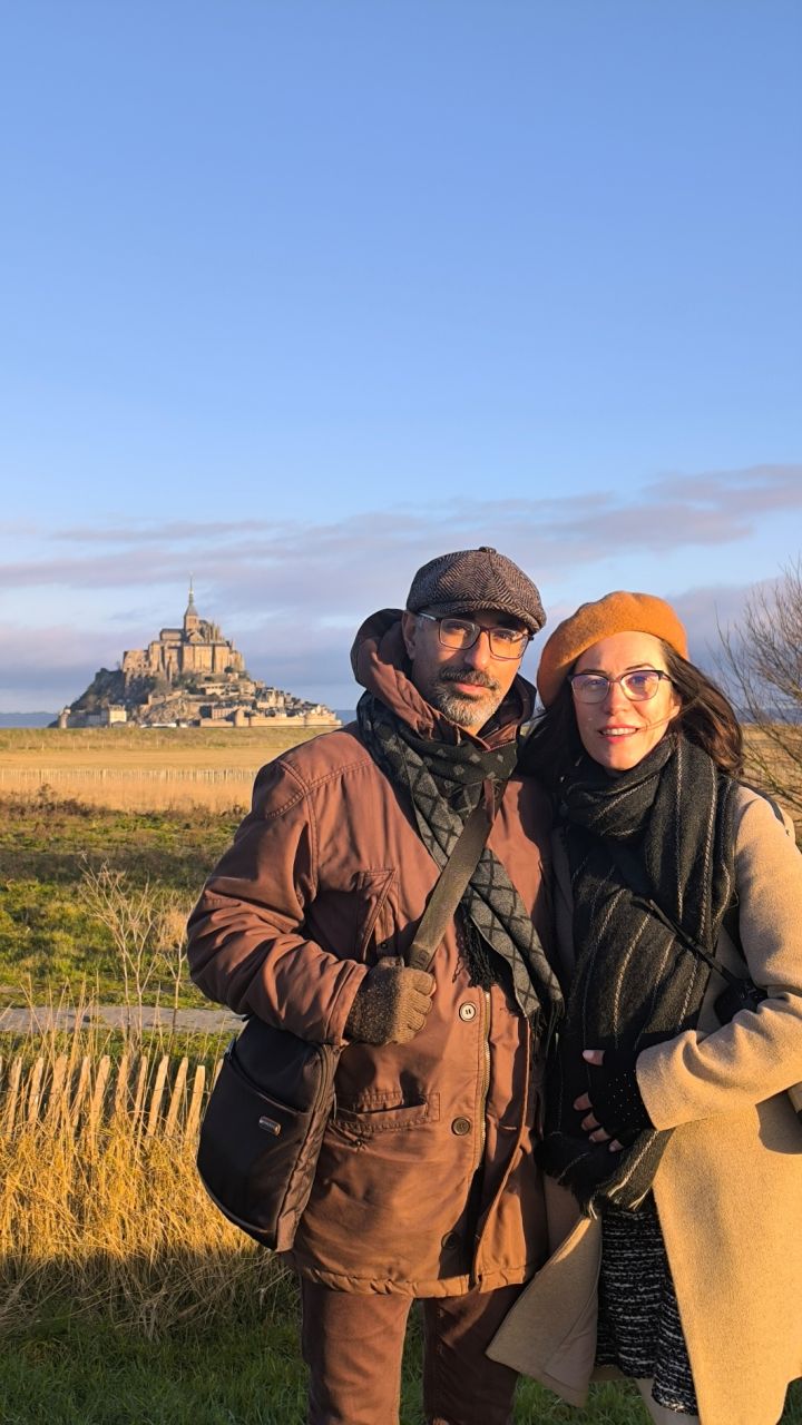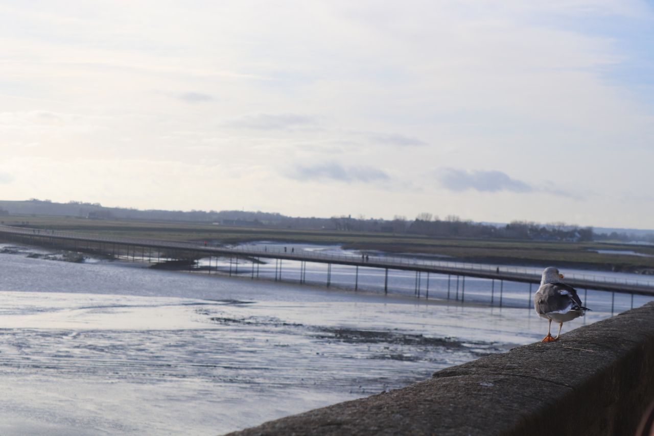 Araba ile yolda ilerlerken, kırsalın ortasında Mont Saint-Michel’in o ince, yüksek kulesi uzaktan göründüğü an içimi tarif etmesi zor bir heyecan kapladı. Yaklaştıkça bu duygu daha da arttı. Arabamızı geniş otopark alanına bıraktık; turizm ofisinin önünden adaya giden shuttle servisler vardı, normalde yürüyerek yaklaşık 30 dakika süren bir yol. Erken gitmiş olmamızın verdiği sakinlikle mi, yoksa aceleciliğimizden mi bilmiyorum, servisi beklemeden yürümeye karar verdik. İyi ki de öyle yapmışız. Uzun tahta köprüden adaya doğru ilerlerken rüzgâr oldukça sertti ama yol çok güzeldi. O saatlerde deniz çekilmişti; köprünün altı sularla değil, farklı renklerde çamurlu topraklarla kaplıydı. Martılar özgürce uçuyor, manzara her birkaç adımda bir durup fotoğraf çekme isteği uyandırıyordu. Adaya varana kadar geçen o yürüyüş, gezinin en keyifli anlarından biri oldu ve “iyi ki yürümüşüz” dedik.