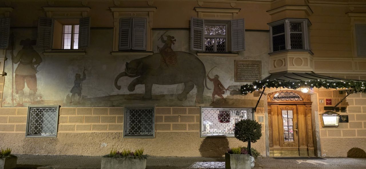 Bugün Hotel Elephant olarak bilinen binanın cephesindeki fil resmi, 16. yüzyılda Avrupa’yı dolaşan gerçek bir filin burada konaklamasıyla ilişkiliymiş. Rivayete göre Portekiz’den Habsburg sarayına götürülen egzotik bir fil, Alp geçitlerini aşarken Brixen’de duraklamış ve halk için büyük bir merak konusu olmuş çünkü o dönem Avrupa şehirlerinde fil görmek neredeyse mucize sayılıyormuş. Bu sıra dışı ziyaret o kadar unutulmaz olmuş ki, konakladığı han zamanla “Fil Hanı” olarak anılmaya başlamış ve cepheye yapılan mural da bu anıyı yaşatmak için yapılmış.